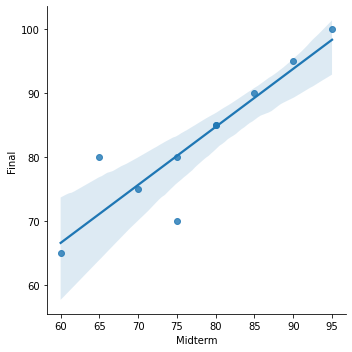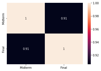 # Scatter plot of midterm grades vs final grades