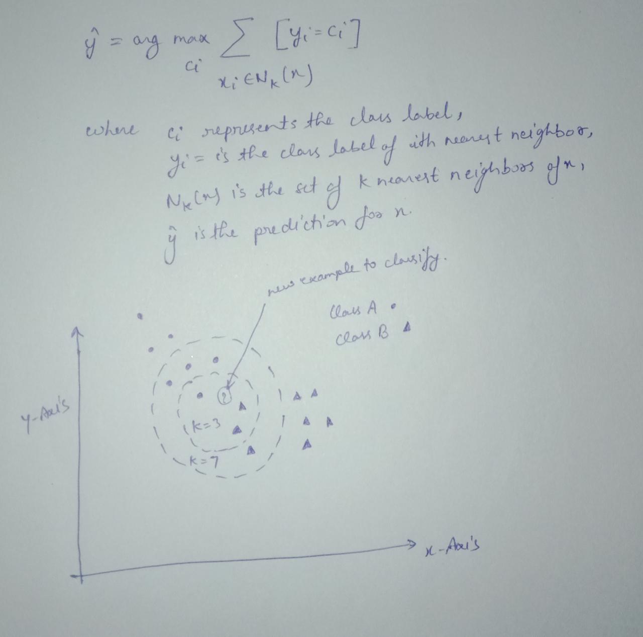 For a classification problem, the K nearest neighbors are assigned to their respective class labels and the majority class label is used as the prediction for x. This can be represented as: