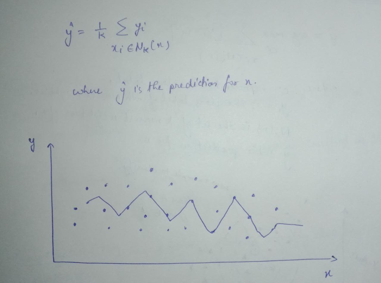 - For a regression problem, the K nearest neighbors are used to predict the value of x by taking the average of their labels. This can be represented as: